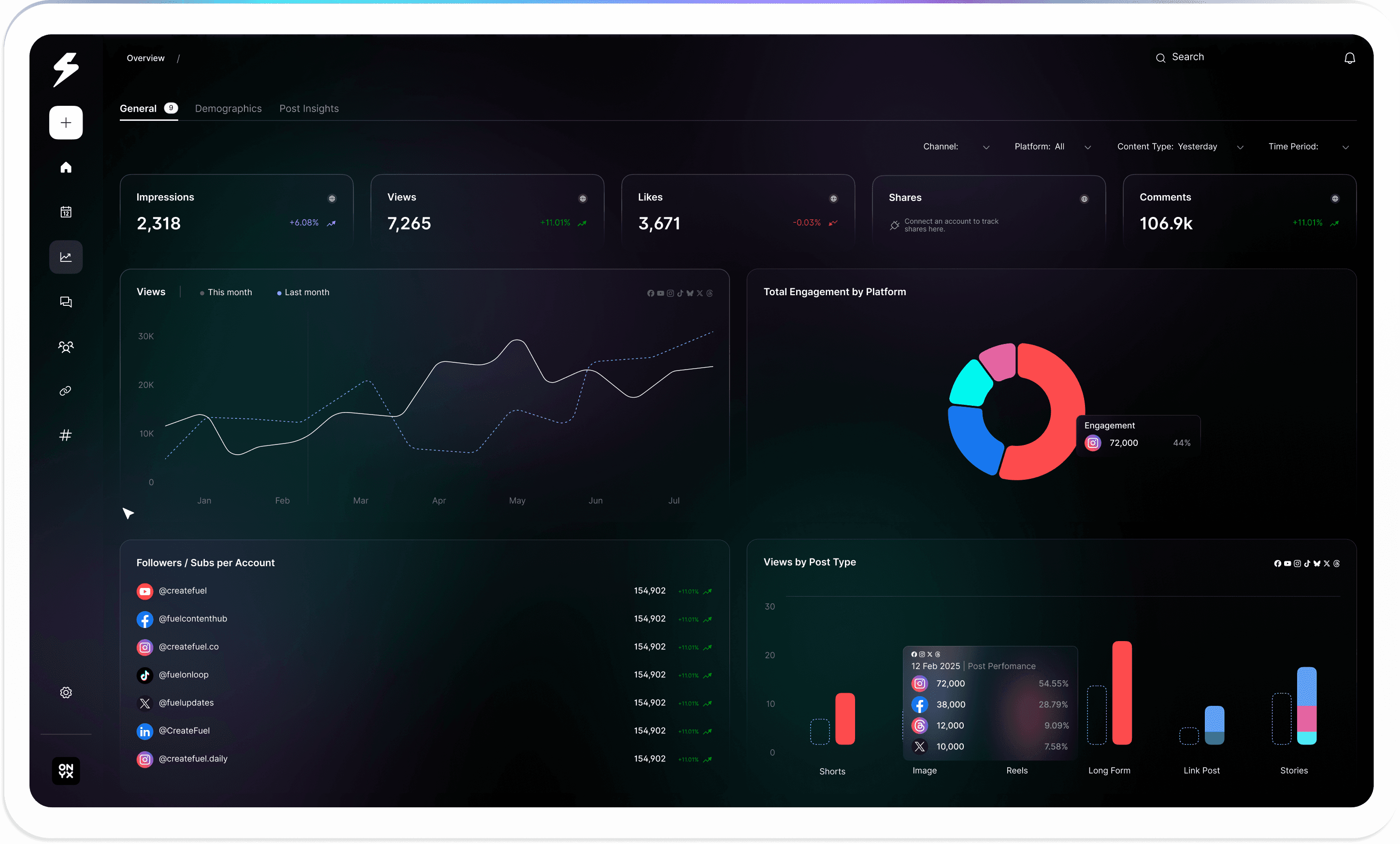 All your essential metrics in one place, impressions, views, likes, shares, and comments. Select a specific platform to zoom into performance trends.