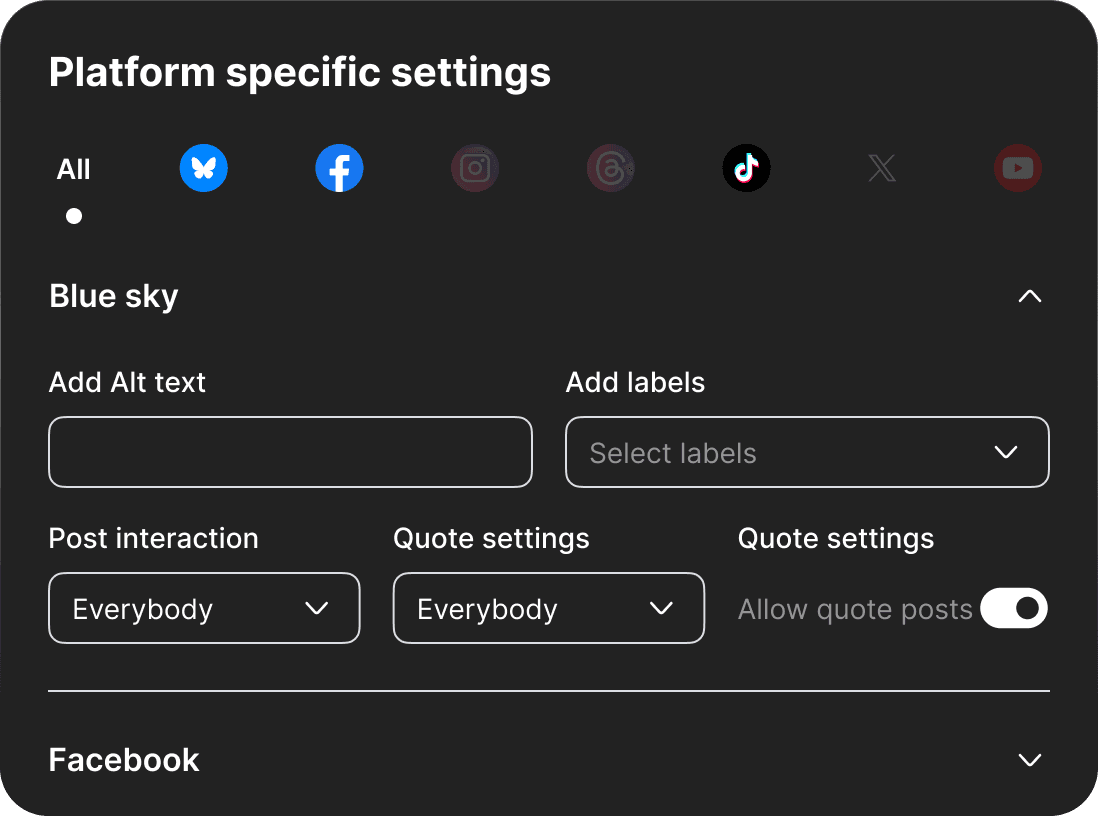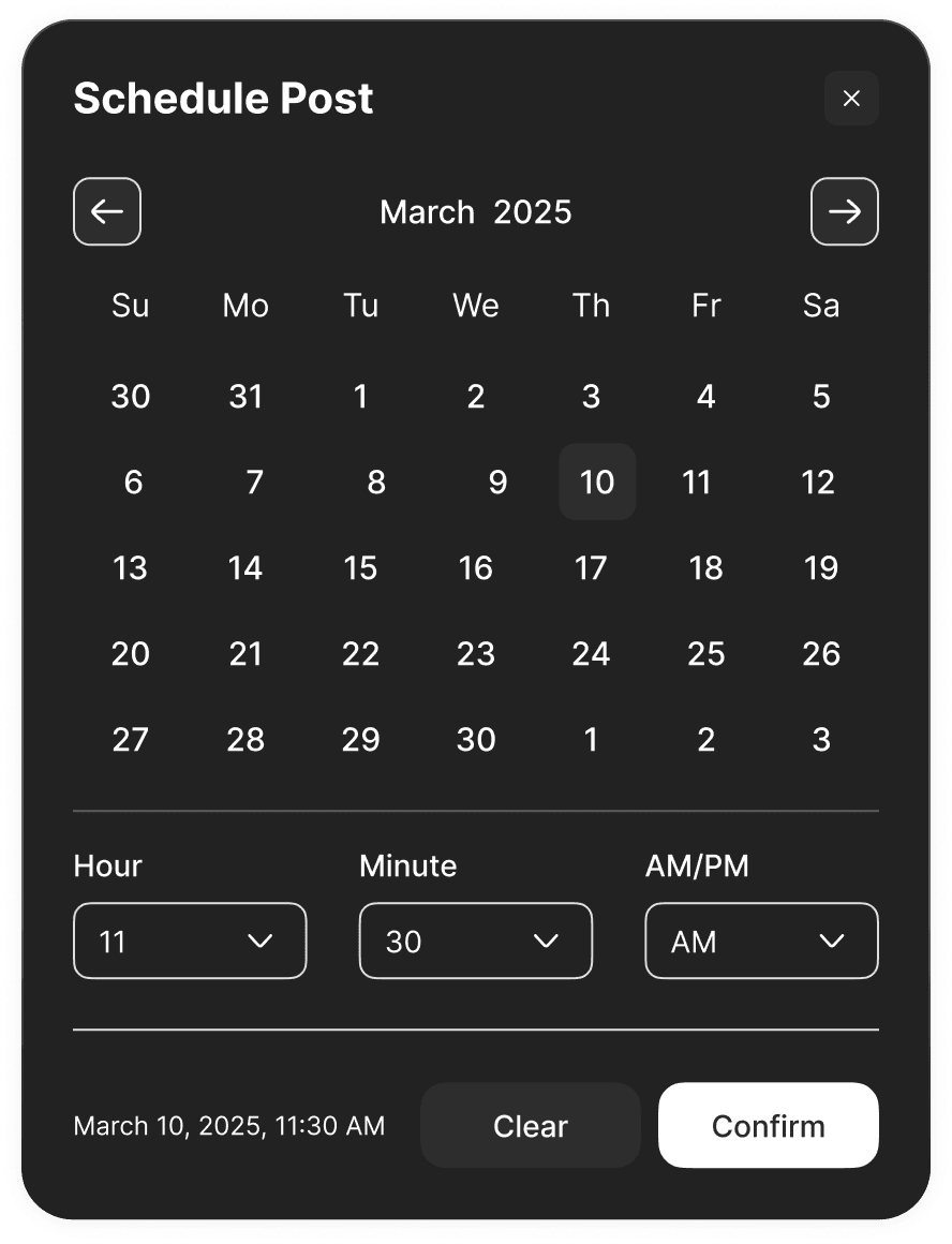 Click the calendar icon to open the date picker. Select a future date and time to schedule your post. Scheduled posts publish automatically at the specified time in your account timezone.
