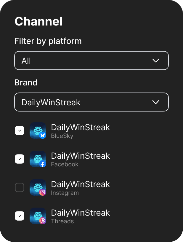 Check the boxes next to channels you want to post to. Channels are organized by brand. Select multiple channels across different platforms. Channels needing reconnection show a warning icon and can't be selected.